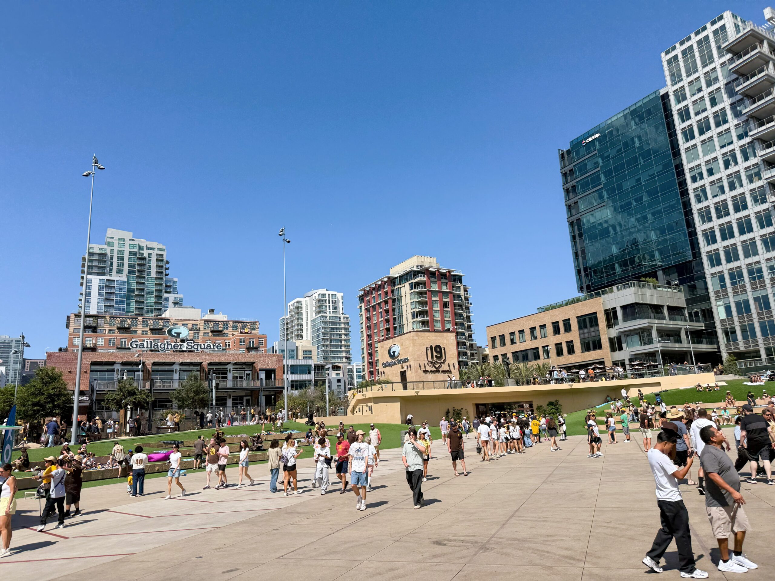 ペトコパークのセンターフィールド後方に位置する「ギャラガー・スクエア」は、ペトコパークの見どころとして多くのファンに親しまれている新しい“公園”エリアです。2024年の改装を経て、芝生ターフに座りながら試合を観戦できるユニークな観戦体験が楽しめるようになりました。子ども向けの遊具や芝生の丘もあり、家族連れでも安心して過ごせる空間です。さらに「Mr. Padre」トニー・グウィン氏の銅像が立つデッキは記念撮影スポットとして人気で、イベント時にはアンフィシアターとして活用され、コンサートやライブも開催されます。野球観戦だけでなく、多彩な楽しみ方ができるギャラガースクエアは、ペトコパークを訪れる際に必ず立ち寄りたい見どころのひとつです。