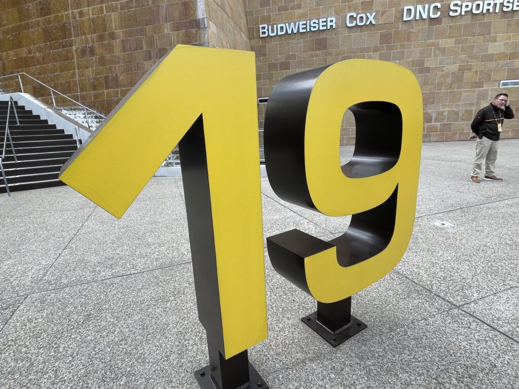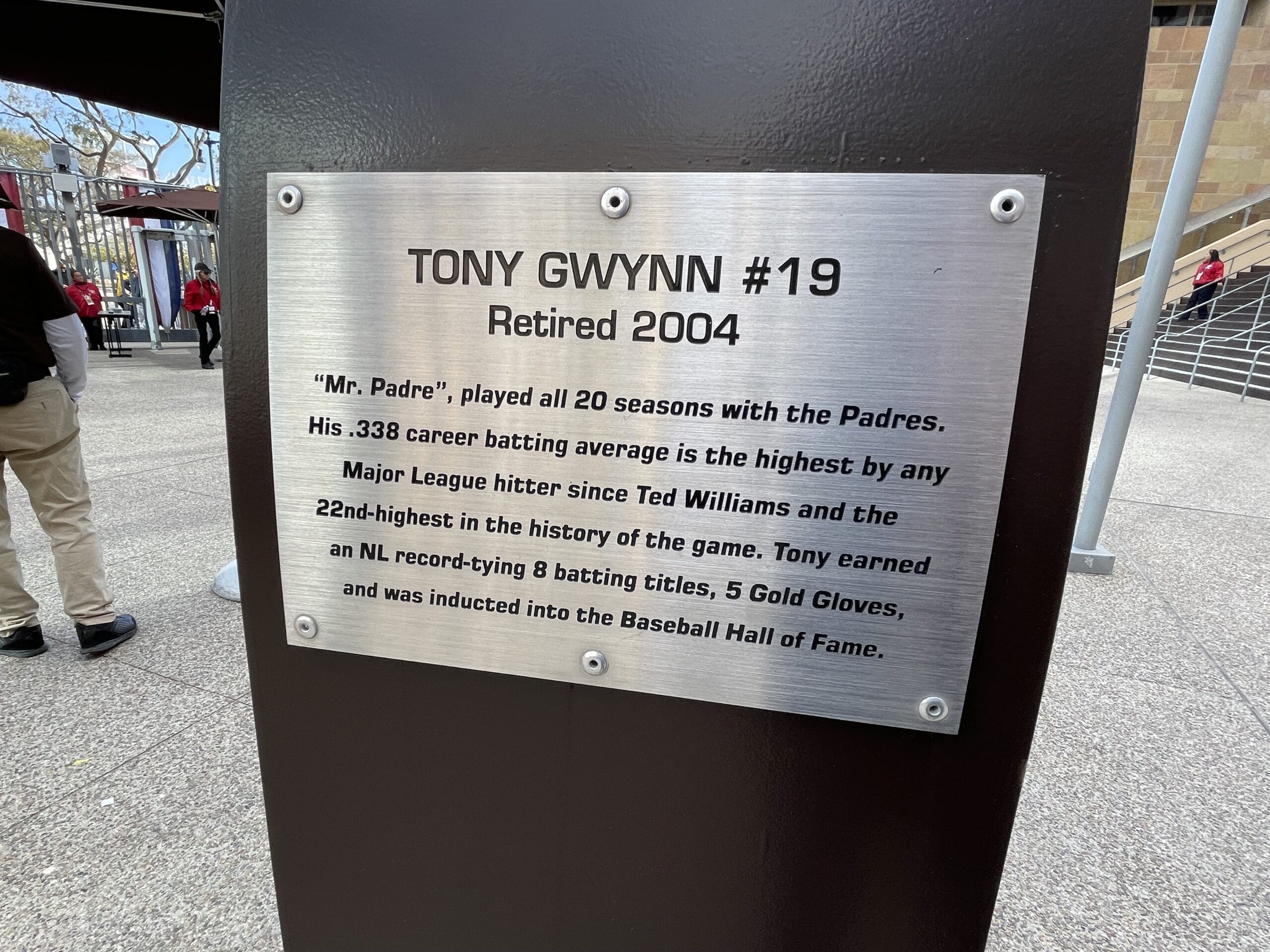 ホームプレートゲートを入った所に、パドレスの殿堂入りした選手たちの背番号のオブジェがあります。番号の横には銘板が付いており、彼らの功績が刻まれています。