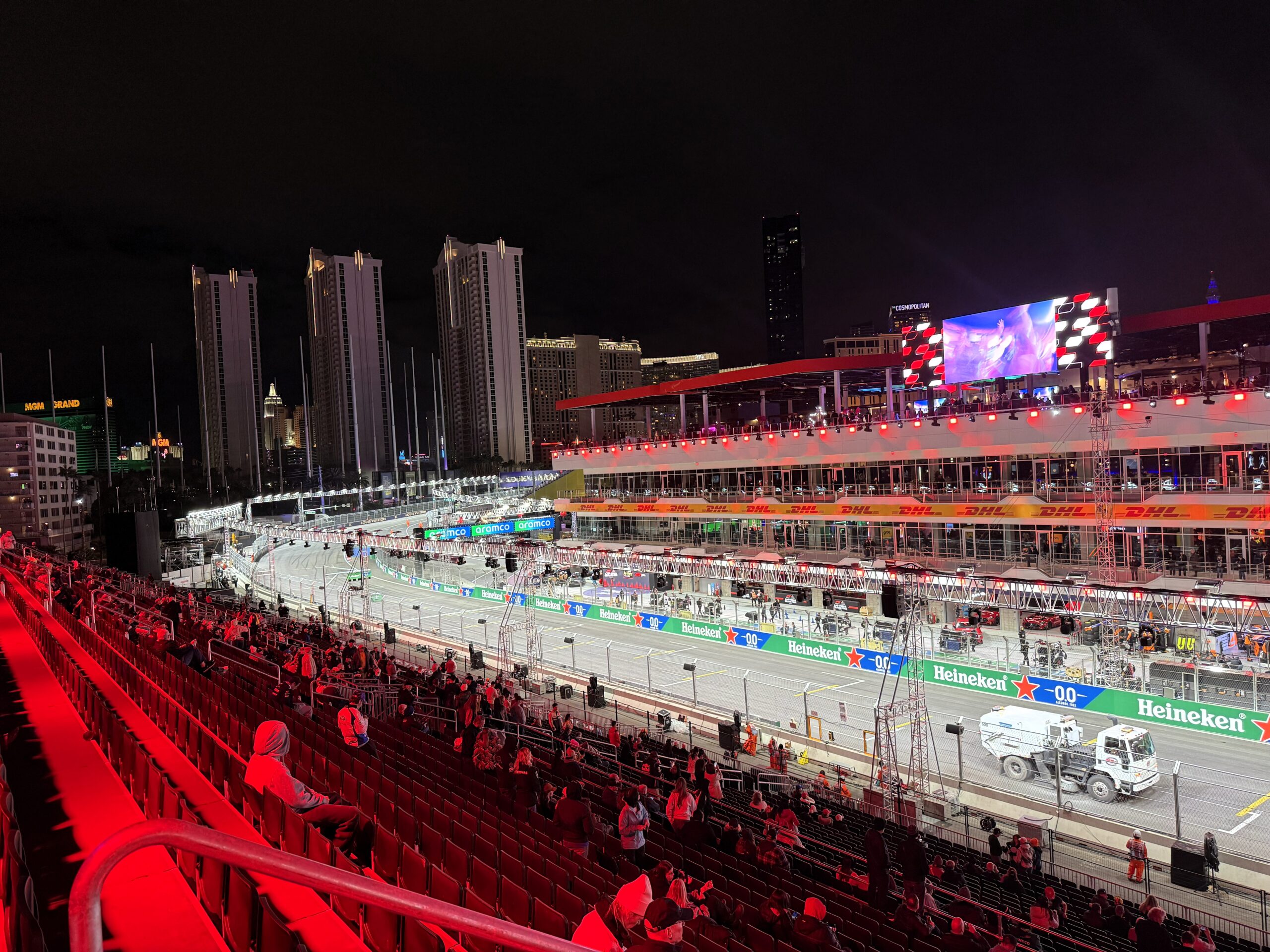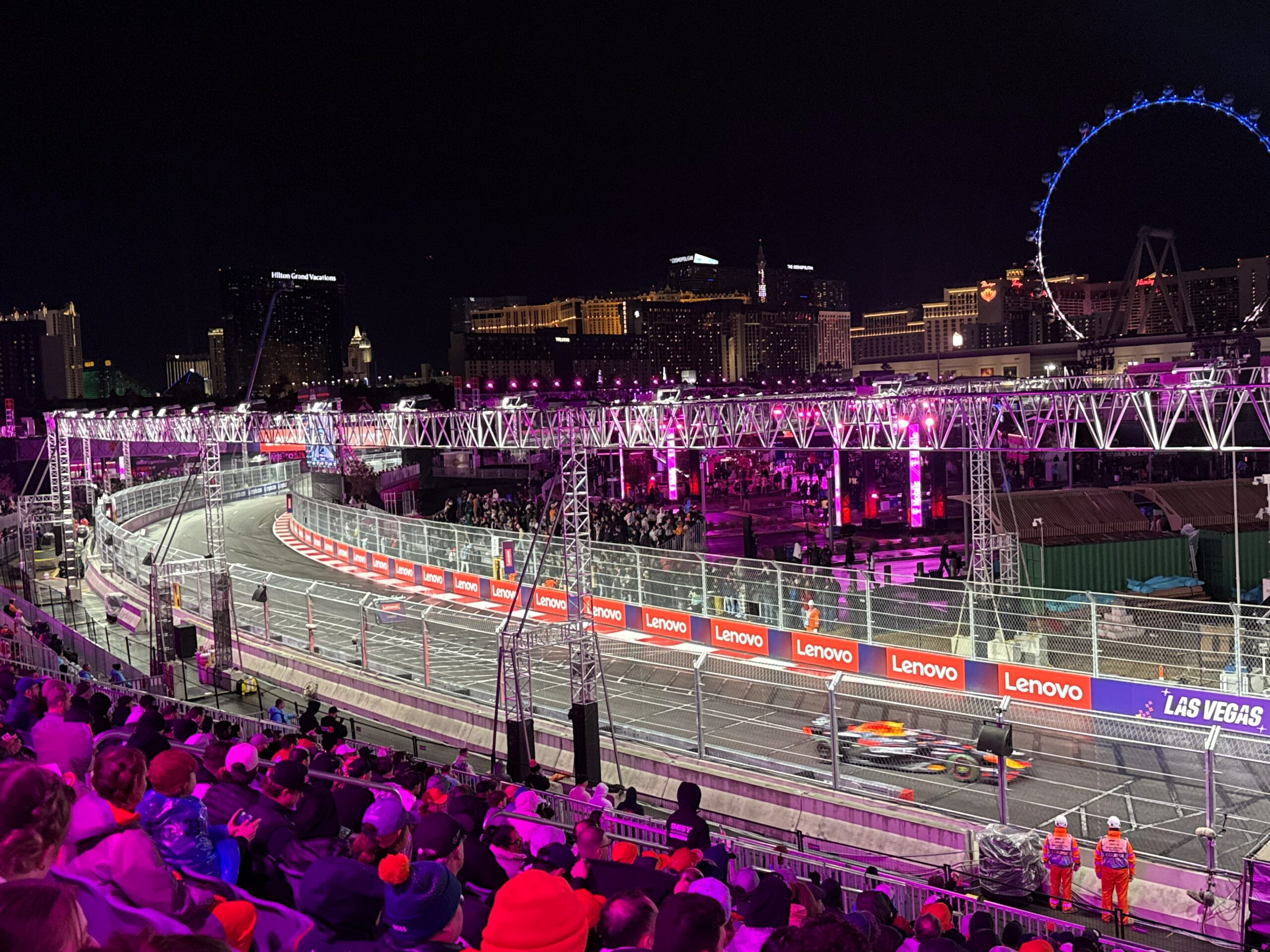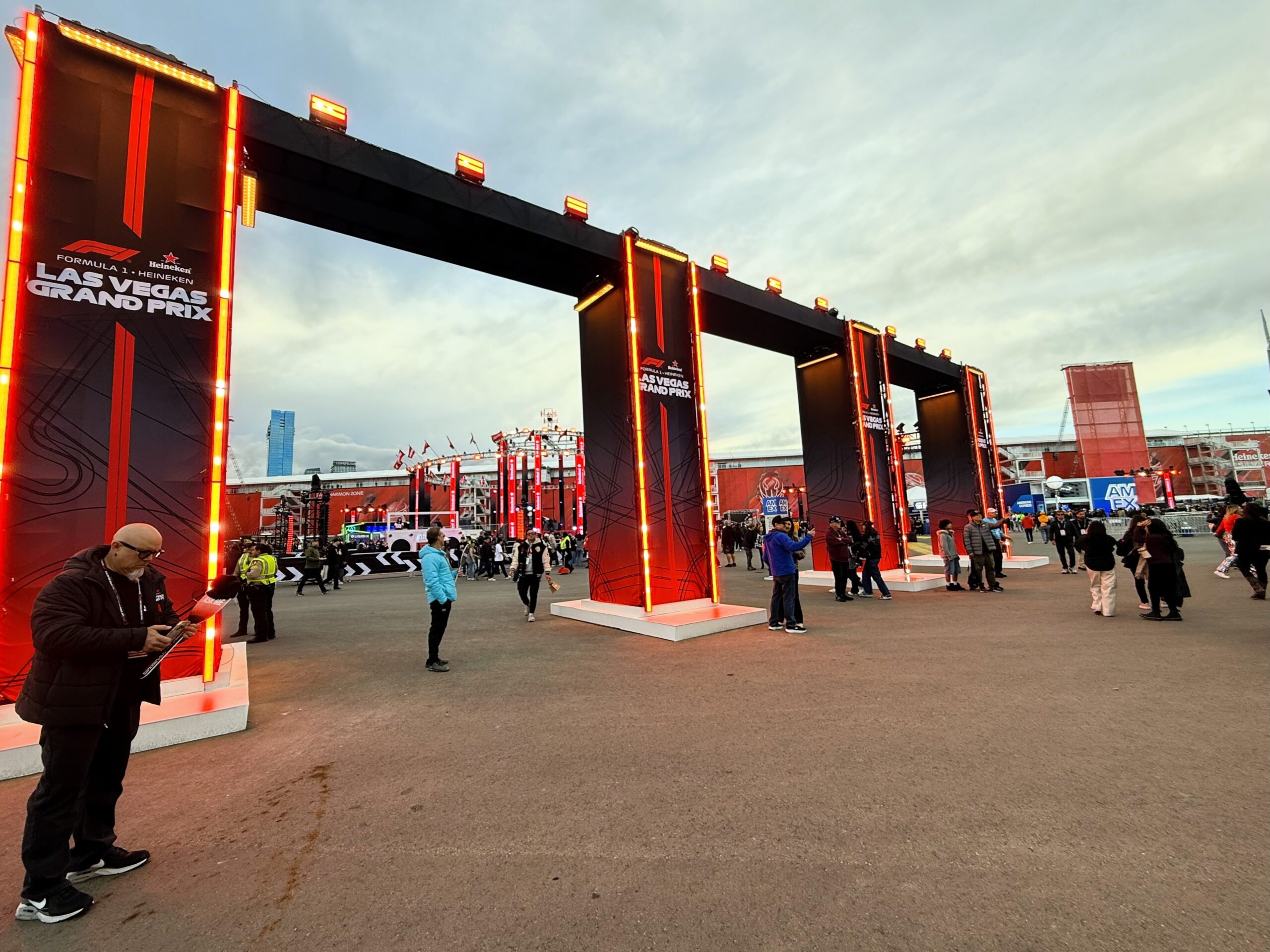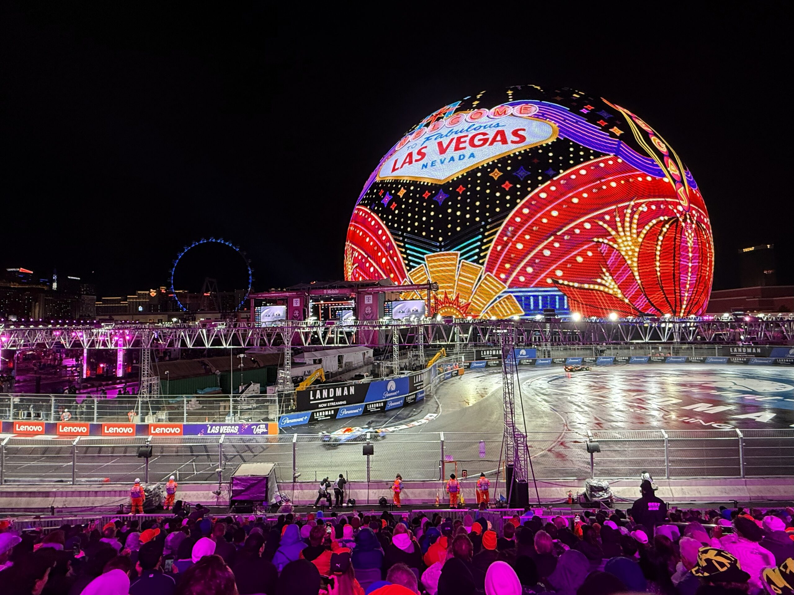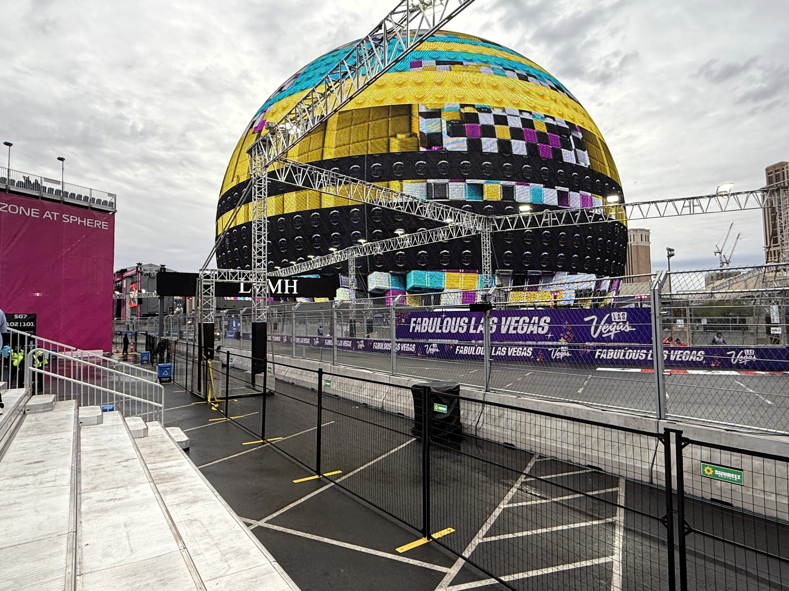 目の前には、ラスベガスの新名所として注目を集める巨大な球体シアター「Sphere(スフィア)」がそびえ立ち、夜になるとダイナミックな映像演出がF1の高揚感をさらに引き立てます。