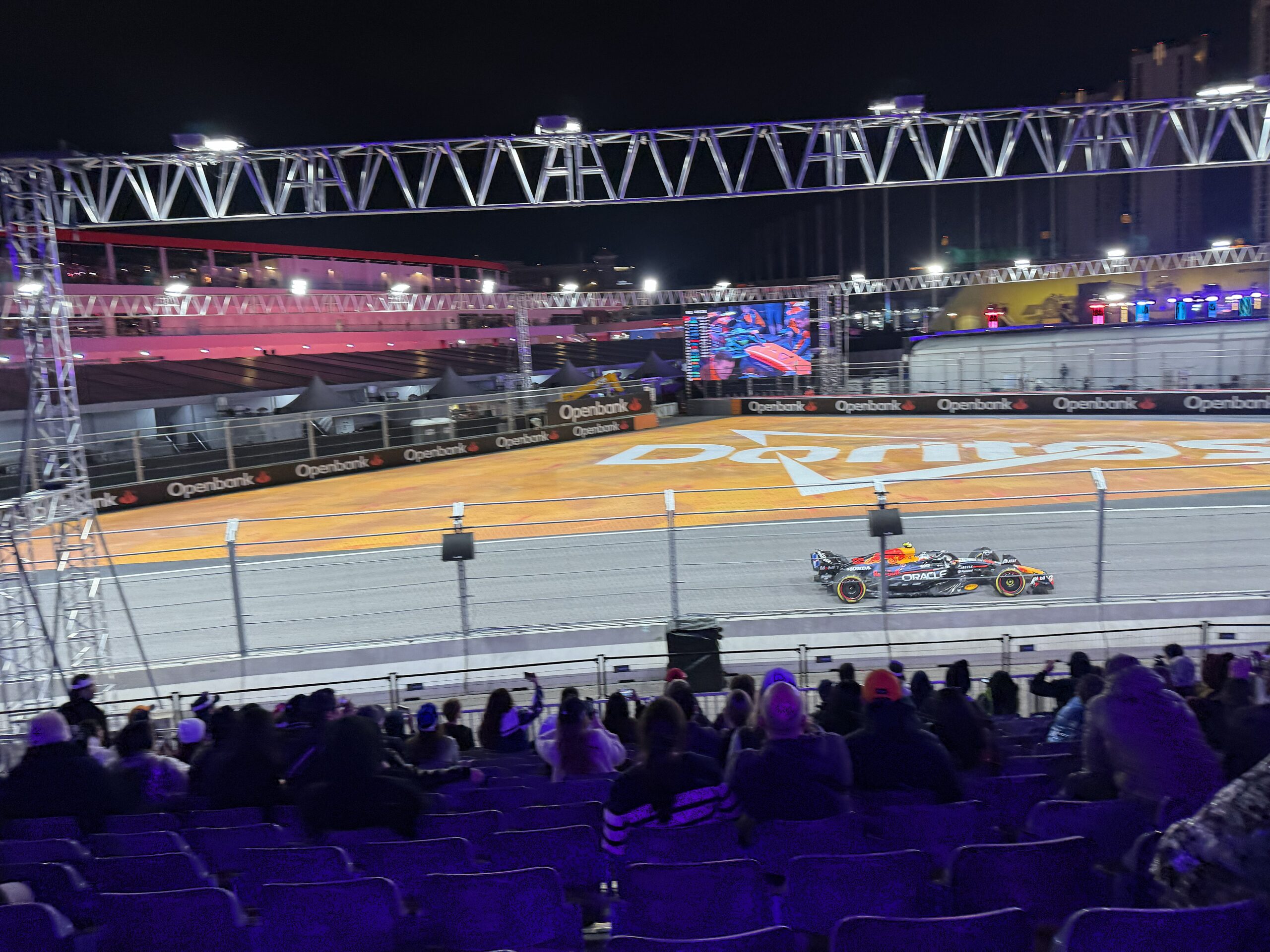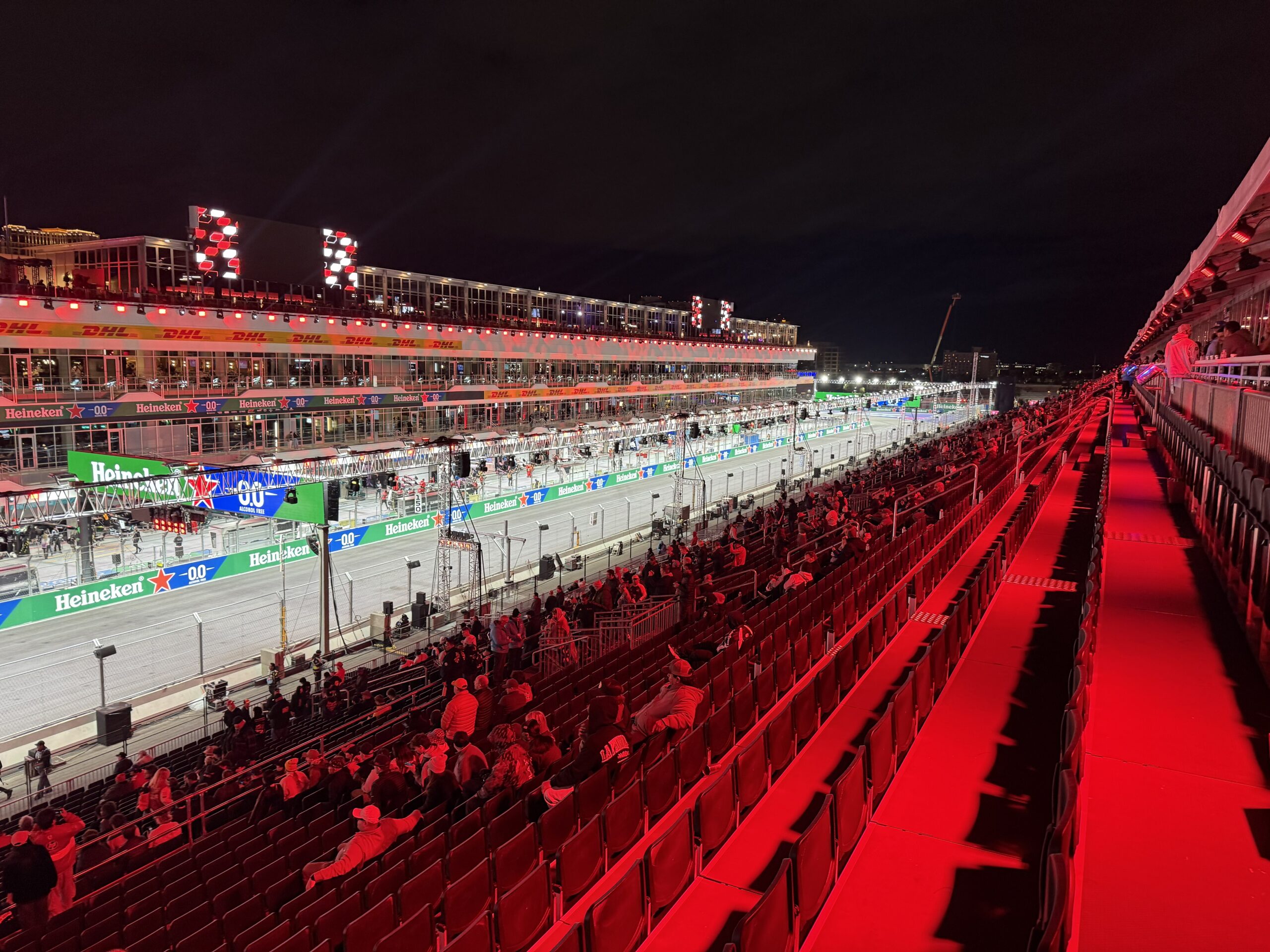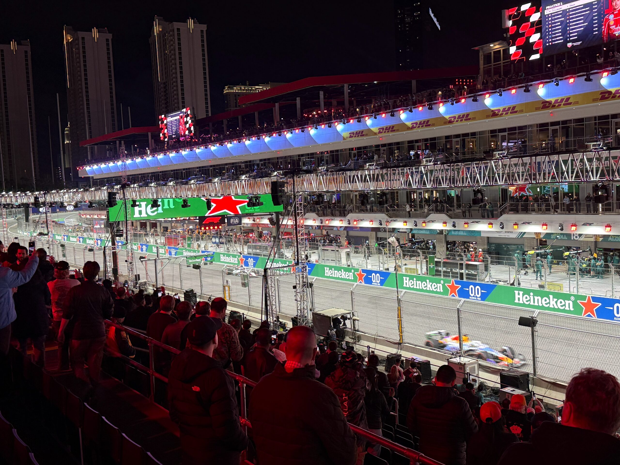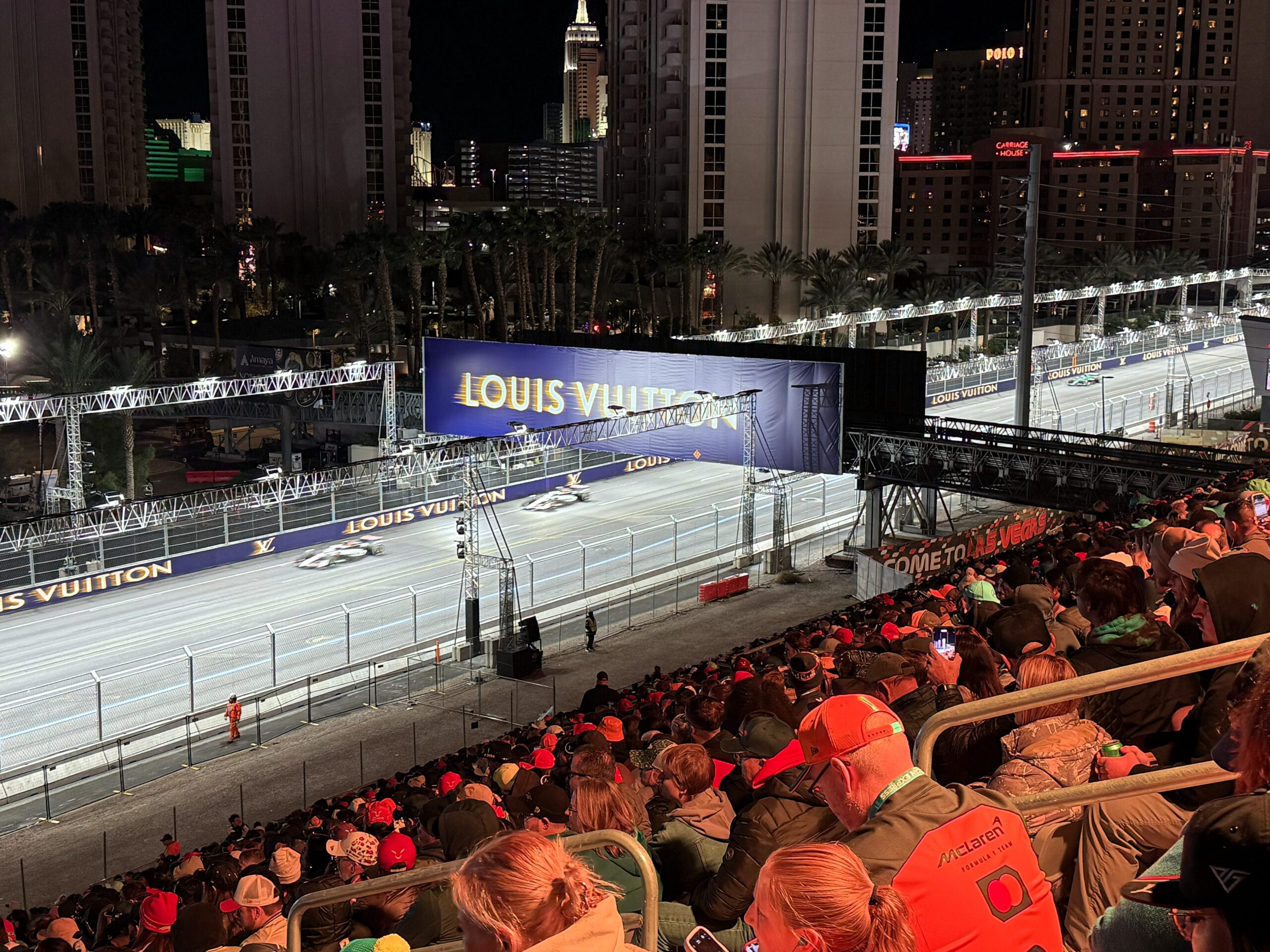 目の前には、ラスベガスの新名所として注目を集める巨大な球体シアター「Sphere(スフィア)」がそびえ立ち、夜になるとダイナミックな映像演出がF1の高揚感をさらに引き立てます。