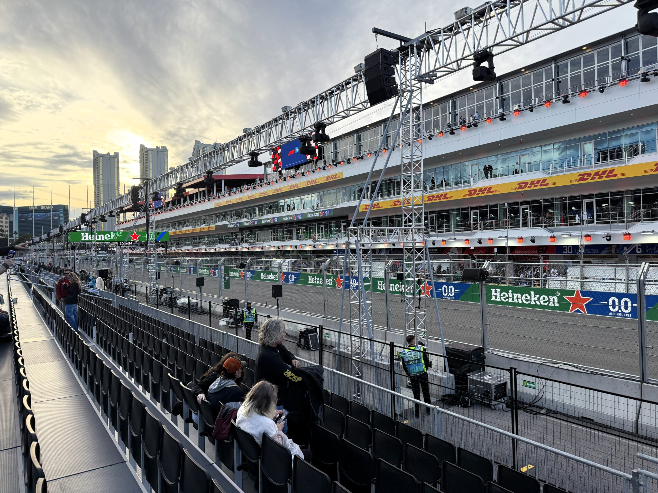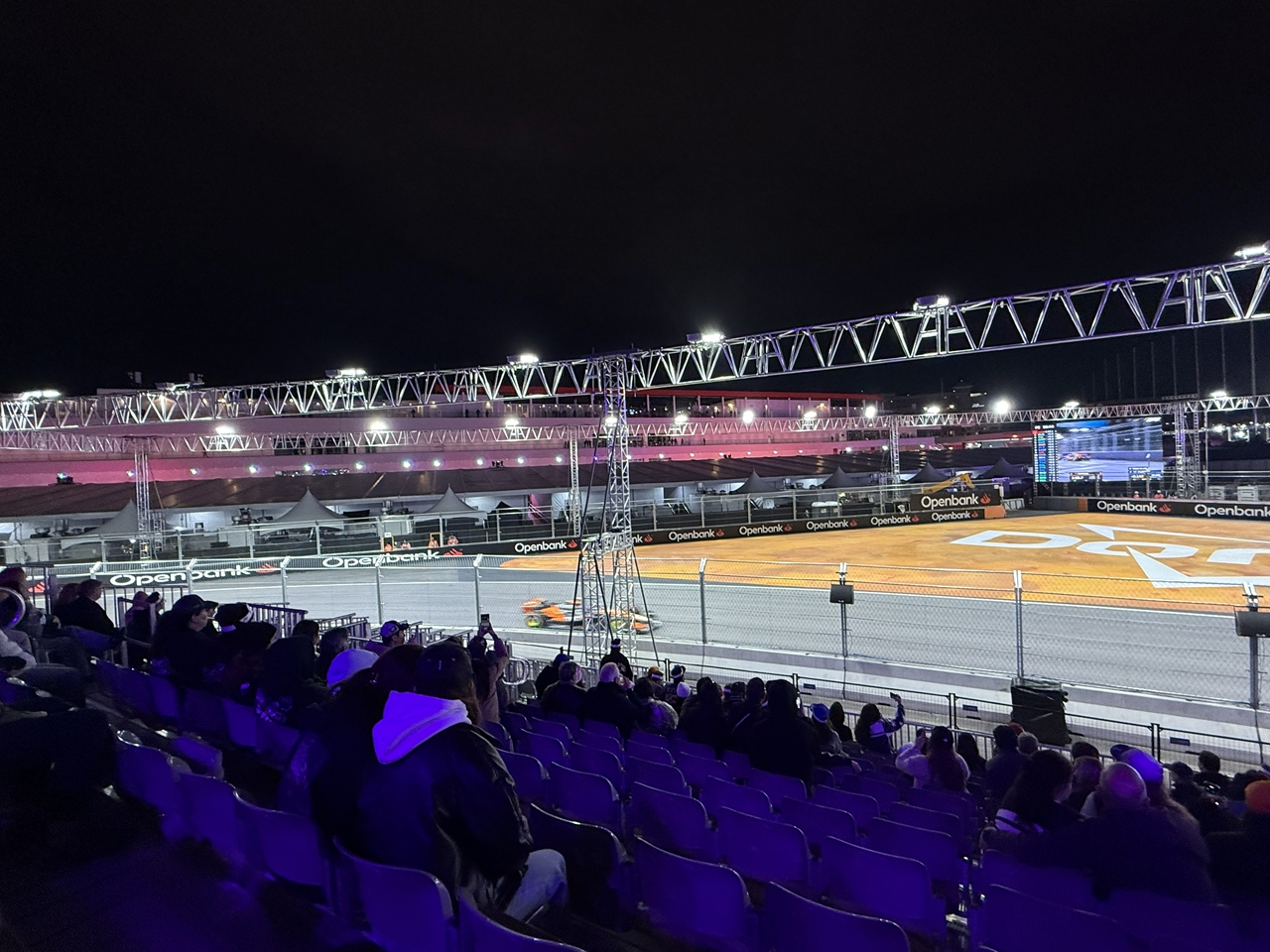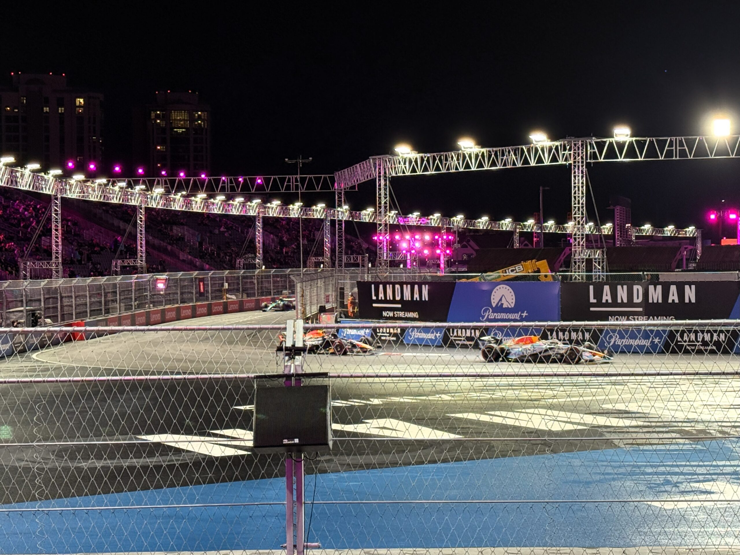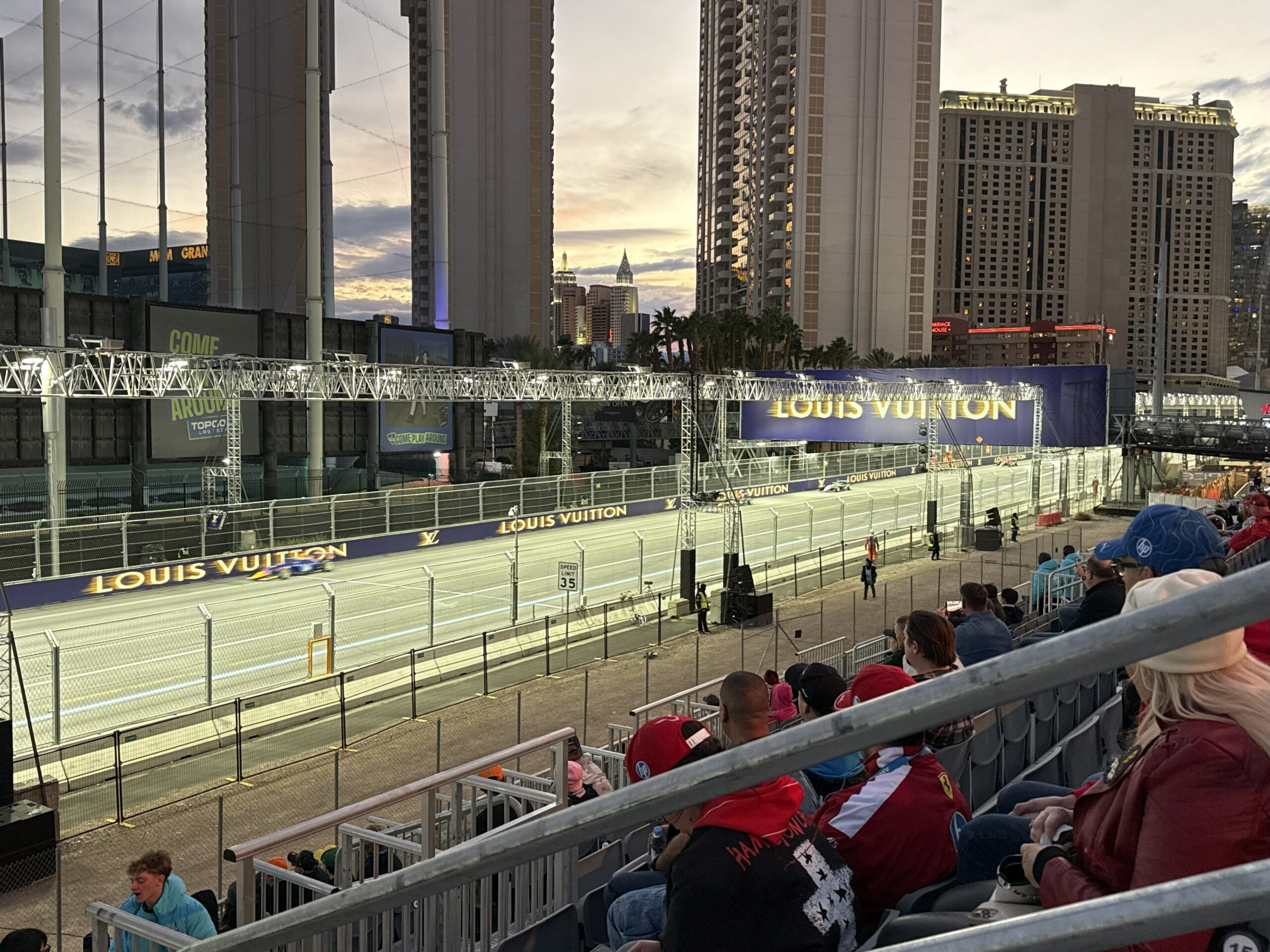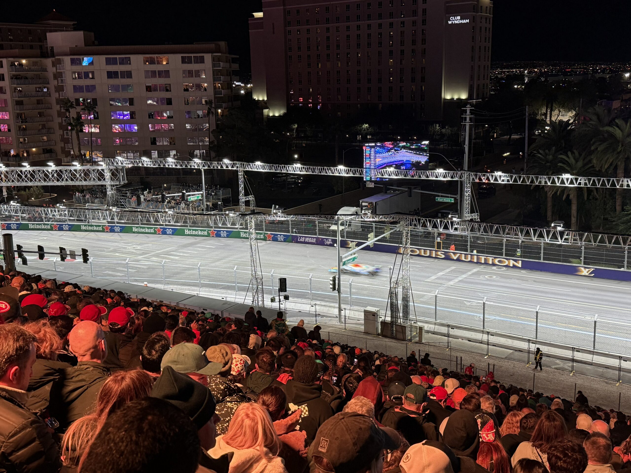 目の前には、ラスベガスの新名所として注目を集める巨大な球体シアター「Sphere(スフィア)」がそびえ立ち、夜になるとダイナミックな映像演出がF1の高揚感をさらに引き立てます。