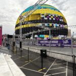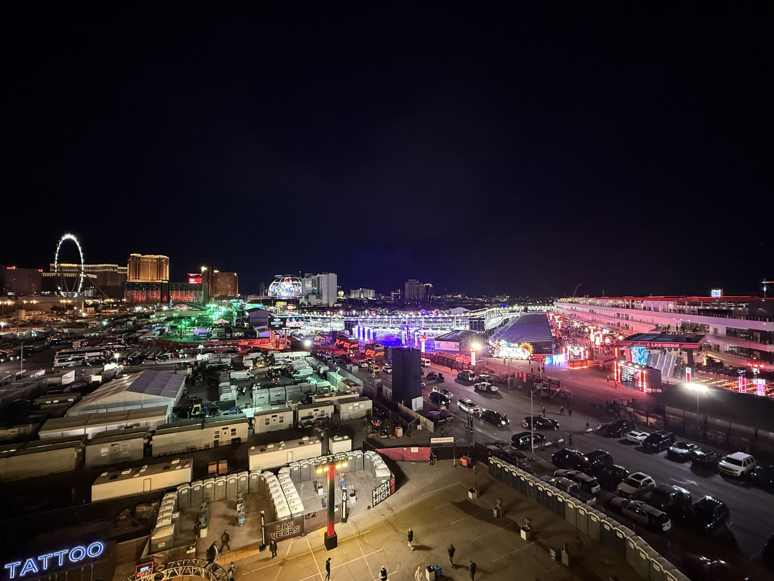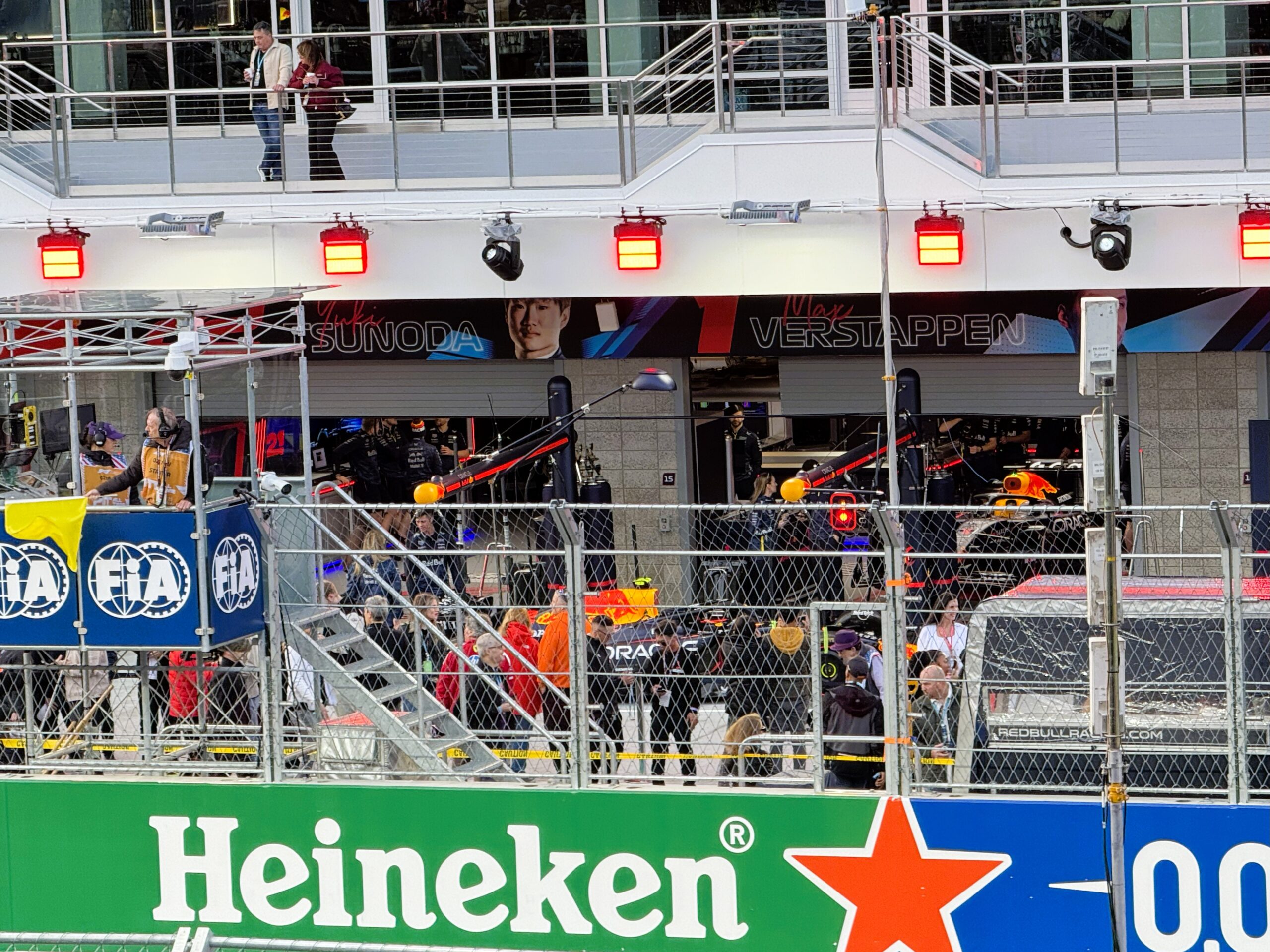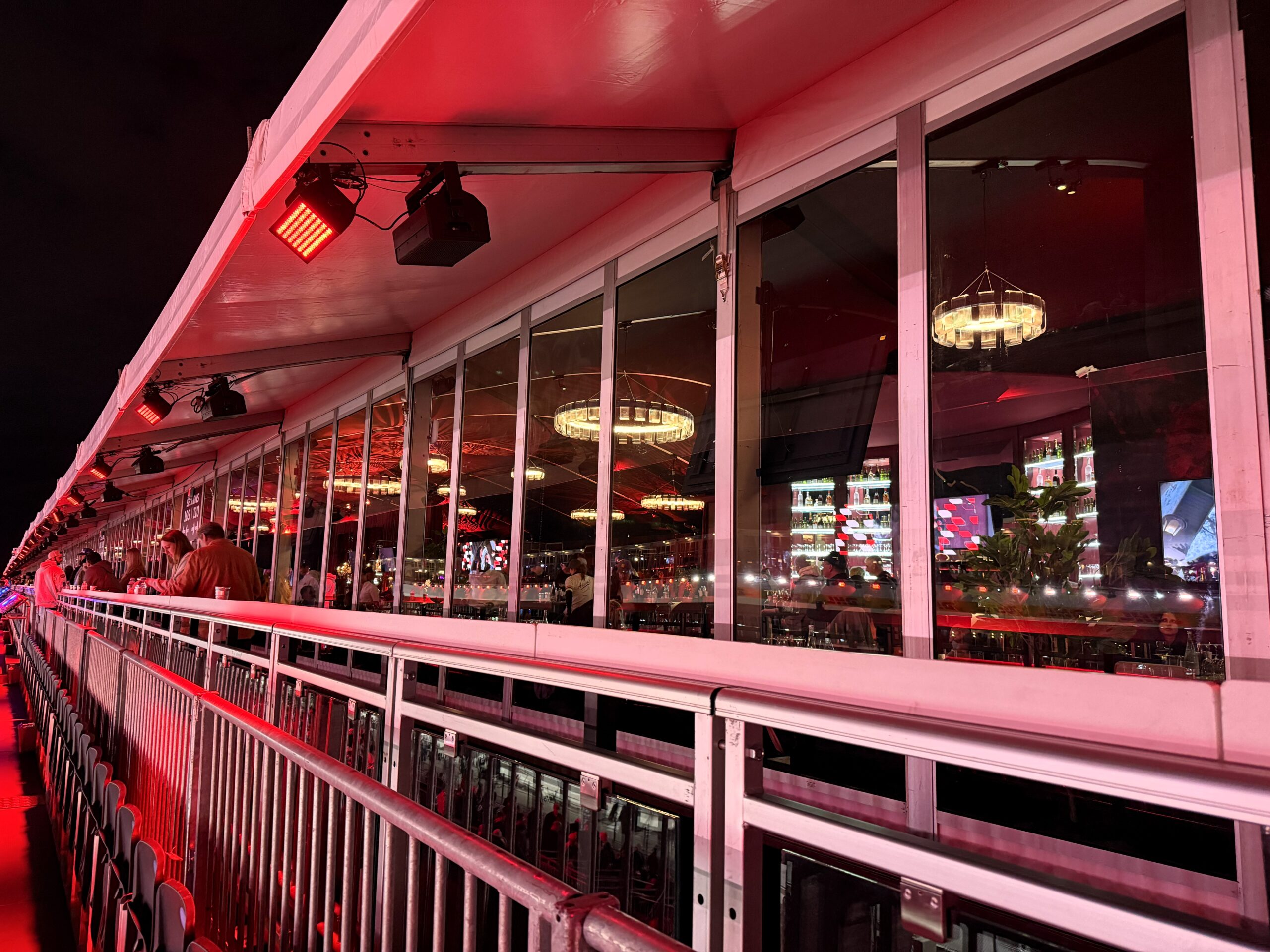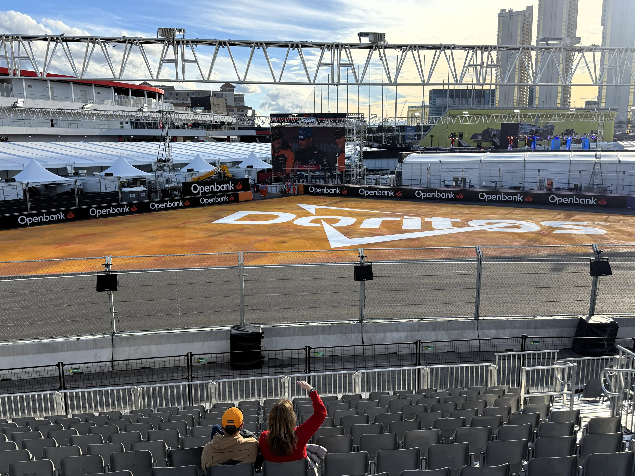 目の前には、ラスベガスの新名所として注目を集める巨大な球体シアター「Sphere(スフィア)」がそびえ立ち、夜になるとダイナミックな映像演出がF1の高揚感をさらに引き立てます。
