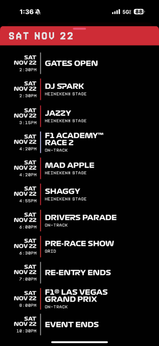 2025年F1ラスベガス・グランプリの各ゾーンの開場時間は3日間共に14時30分でした。