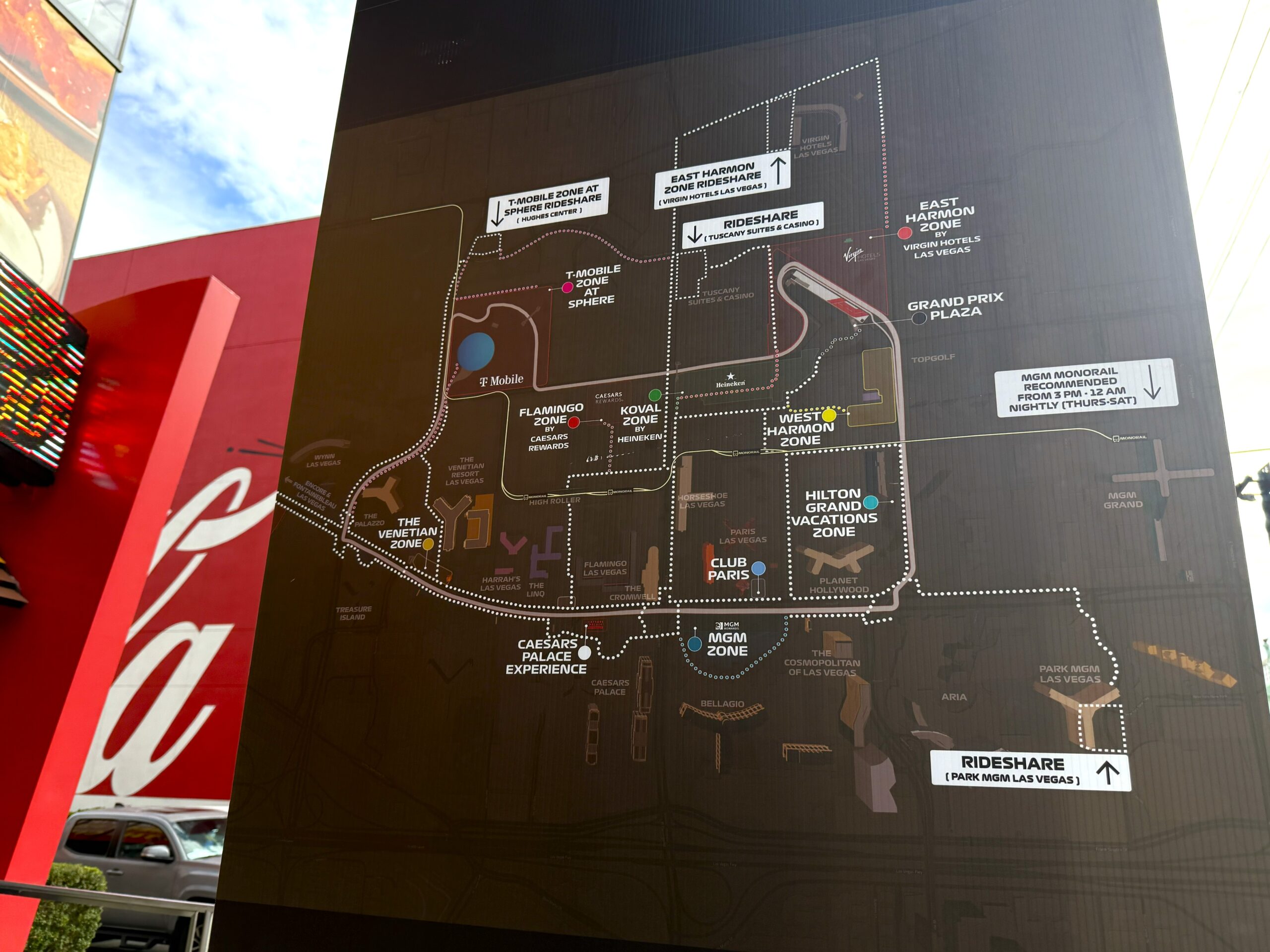 ラスベガス大通りの歩道には、上の写真の様な各ゾーンまでのアクセスマップがあり、白の点線で動線が記されていますが、初めてラスベガスを訪れる方にはとてもわかりづらい動線が示されている箇所もあります。「F1ラスベガス・アプリ」でもMAPを開くと、GPSで自分が居る場所からゾーンの入口までの動線が示されますので目安にはなります。ここでは2025年大会の体験をもとに、「ラスベガス大通り」から、出来る限り分かりやすい主なゾーンまでの行き方、各ゾーンの紹介を含めてのご案内です。(2026年大会以降、変更になる場合もございます)