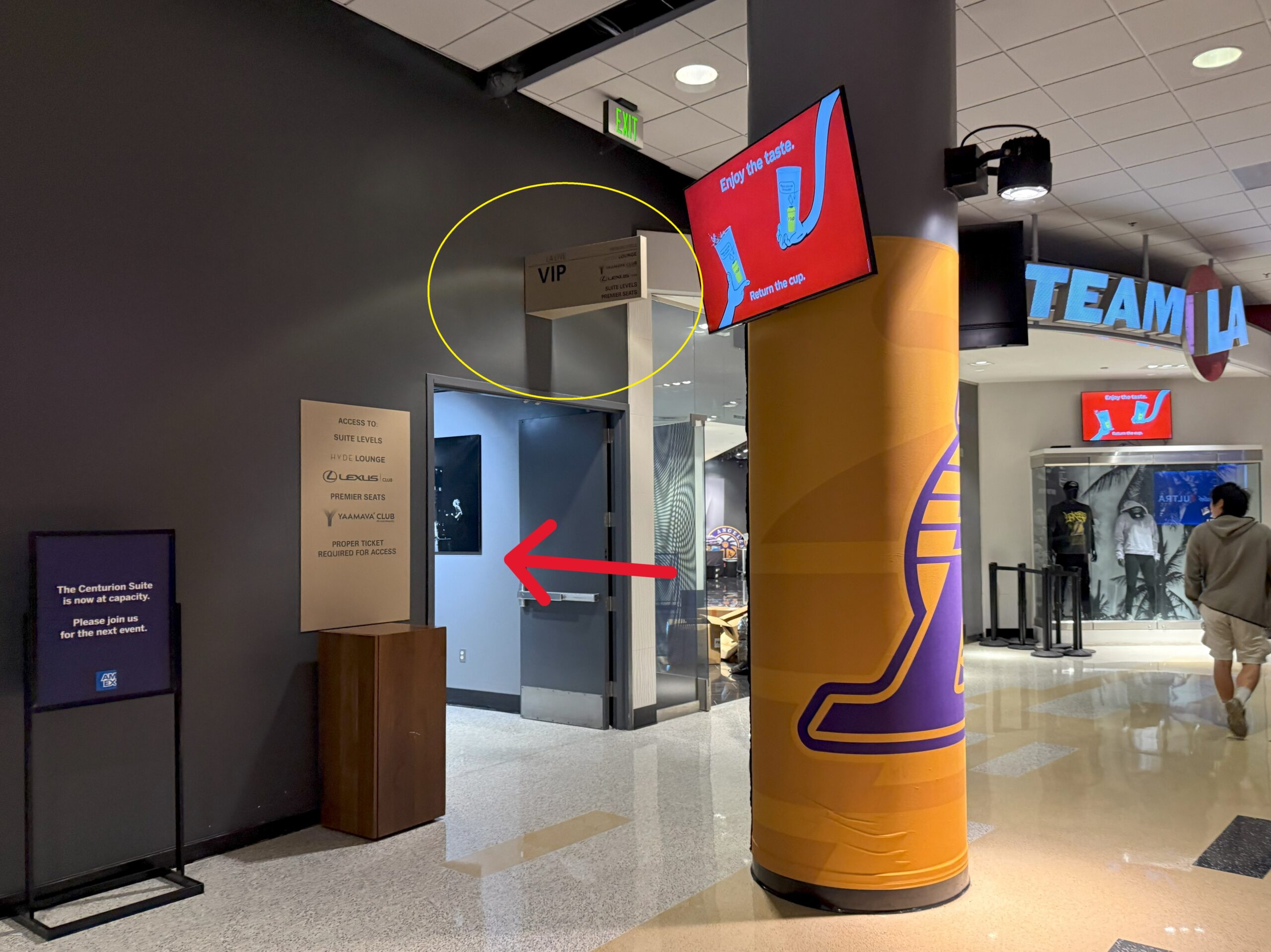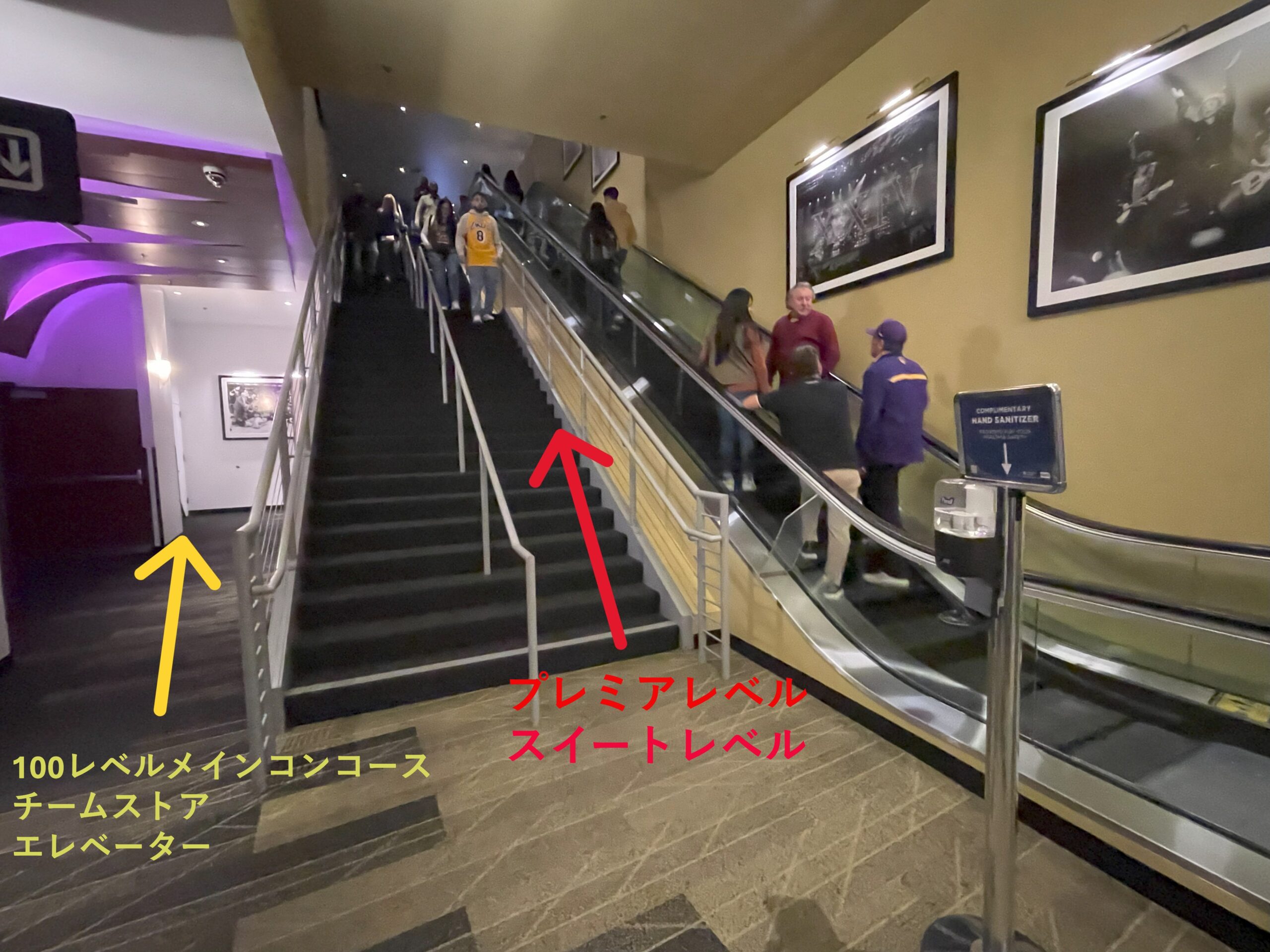 100レベルのメインコンコースからプレミアレベル、スイートレベルに行く際には、チームストア入口の横にある ”VIP”入口から入ります。(写真下)入る際にはチケットのチェックがありますので提示して下さい。ここを入ると写真上のエスカレーター/階段があります。