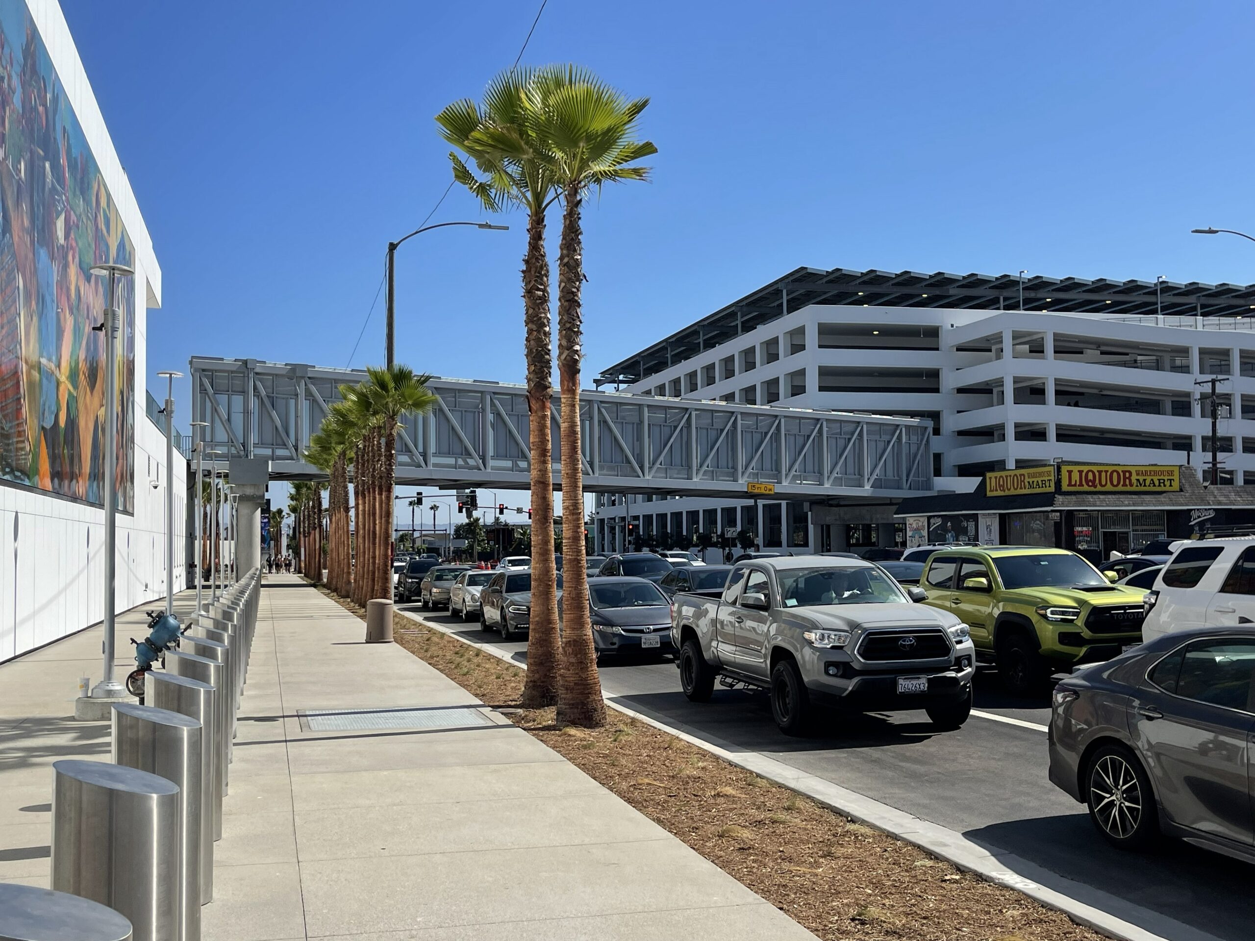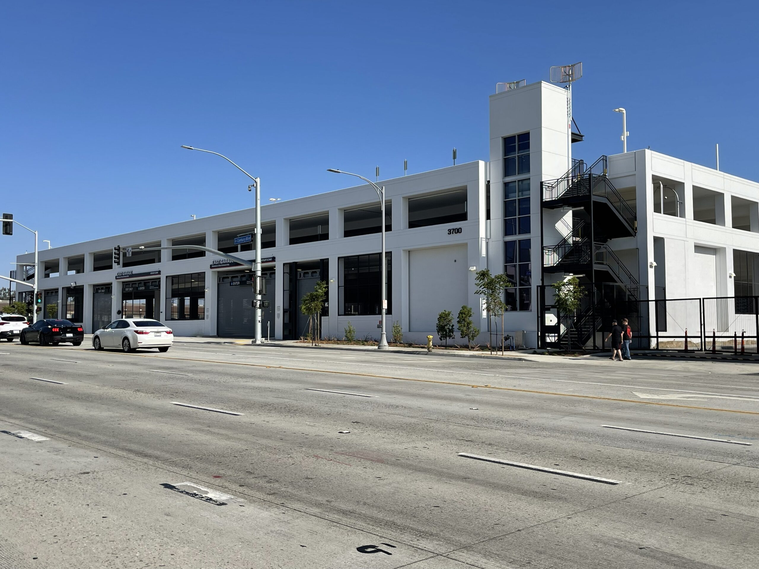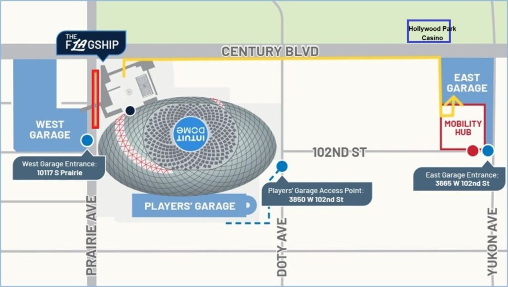 インテュイットドーム周辺で駐車料金を少しでも抑えたい方におすすめなのが「イーストガレージ」です。この駐車場はインテュイットドームからCentury Blvd.を東へ進んだ場所にあり、徒歩でおよそ5分ほどの距離にあります。アリーナに隣接しているわけではありませんが、一般的なスポーツアリーナの駐車場として考えれば十分に便利な立地で、少し歩く代わりに駐車料金を抑えられるのが大きな魅力です。実際、VIPウエスト・ガレージと比べると、試合日でもおおよそ20ドルほど安く利用できることが多く、コスト重視の方には現実的な選択肢といえるでしょう。なお、利用する際に特に注意したいのが駐車場入口の場所です。入口は建物の正面ではなく裏側にあるため、カーナビやGoogleマップを設定する際は「3665 W 102th St., Inglewood, California」と入力するのがおすすめです。この住所を設定すれば、スムーズに駐車場入口まで案内されます。3700 Century Blvd.の住所では入口はありません。駐車後はCentury Blvd.をインテュイットドームへ向かいます。