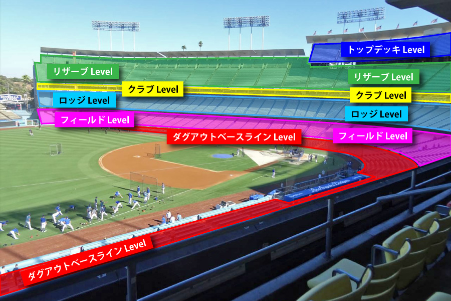 ドジャースタジアムは基本的には4階層のスタジアムとなり、1階席部分のフィールドレベル(ダグアウトクラブ、ベースラインクラブ含む)、2階席部分のロッジレベル、3階席部分のリザーブレベル、4階席部分となるトップデッキで構成されています。
